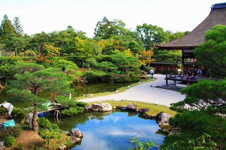 池泉式指園林構(gòu)架以池塘和流泉組合為主景觀,筑山庭則是偏重于地形上筑土為山,平庭對應(yīng)于筑山庭指在平坦的基地上進(jìn)行園林規(guī)劃,在平地上追求深山幽谷之玲瓏,海岸島嶼之渺漫的效果;筑山庭庭都有真、行、草、三種形式,真庭是對真山真水的全方位模仿,而行庭是局部的模擬和少量的省略;草庭是大量的省略。