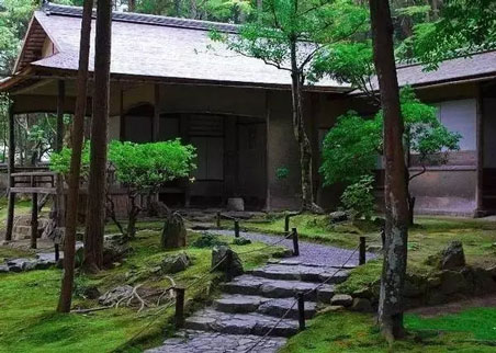 茶庭也叫露地是源自茶道文化的一種園林形式,至今茶庭的景觀作用己大于實(shí)用功能。茶庭式園林一般是在進(jìn)入茶室的一段空間里,按一定路線布置景觀,以拙樸的步石象征崎嶇的山間石徑,以地上的矮松寓指茂盛的森林,以蹲踞式的洗手缽聯(lián)想到清冽的山泉,以滄桑厚重的石燈籠來營造和、寂、清、幽的茶道氛圍。有很強(qiáng)的禪宗意境。