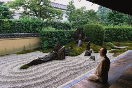 枯山水是日本庭園的精華,實(shí)質(zhì)是以砂代水,以石代島的做法。用極少的構(gòu)成要素達(dá)到極大的意韻效果,追求禪意的枯寂美。枯山水有兩種寓意對象,一是山澗的激流或瀑布,日本稱之為枯瀧;另一種是海岸和島嶼;池泉是微縮的真山水,池泉一般是園景的中心,枯山水與池泉都是在自然布局的水池中設(shè)溪坑石代表島嶼,與岸相連的駁岸稱中島按不同位置分別稱為龜島、鶴島、等名,立在水中或砂中的巖石有更多名稱,在此不再贅述。
